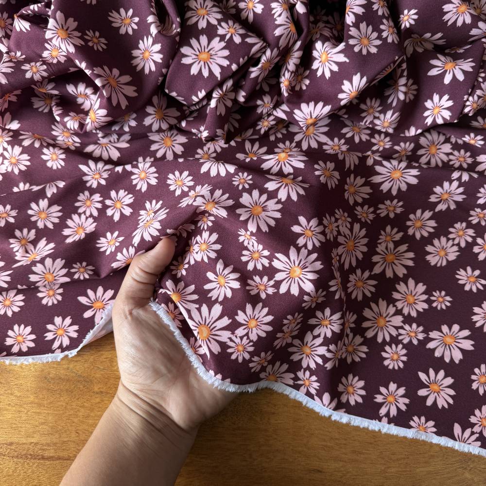 Tecido Estampado Viscoseda - Floral Margaridas Vinho - Atacado