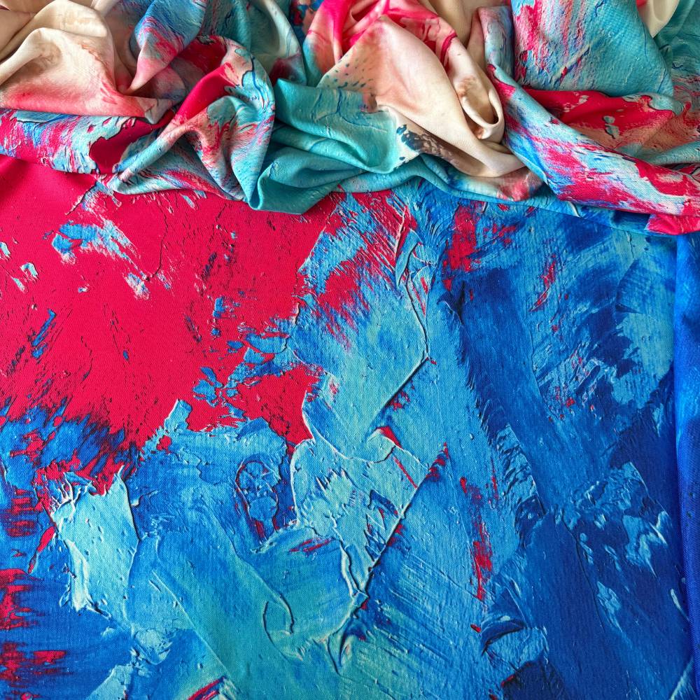 Tecido Estampado Crepe Elise - Marmorizado Pintura Pop Rosa e Azul