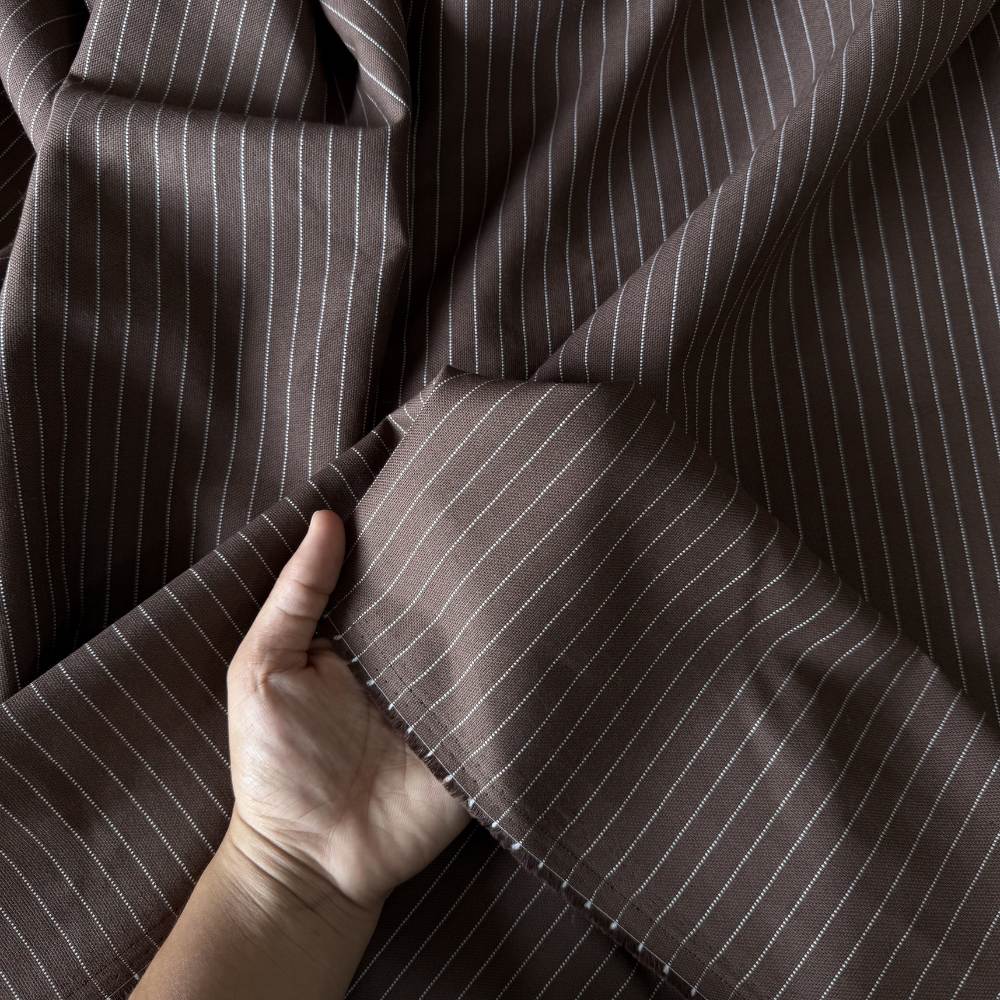 Possui 1,50 m de largura e estampa risca de giz fio tinto, que confere maior durabilidade da padronagem e acabamento premium ao tecido. Um clássico da alfaiataria, perfeito para peças que pedem elegância e presença.